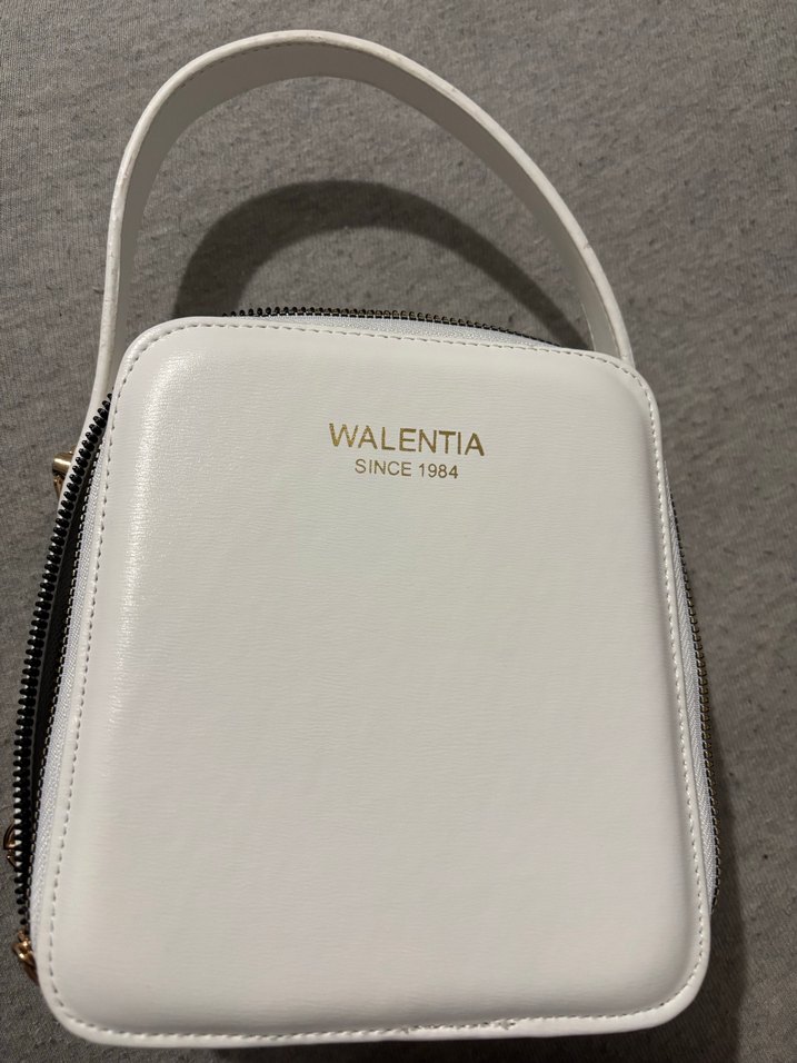 Beyaz deri kadın çantası, fermuarlı kapanışı ve baskılı WALENTIA logosu ile modern klasik tarzı ve Paris şıklığını yansıtıyor. Günlük kullanıma uygundur.