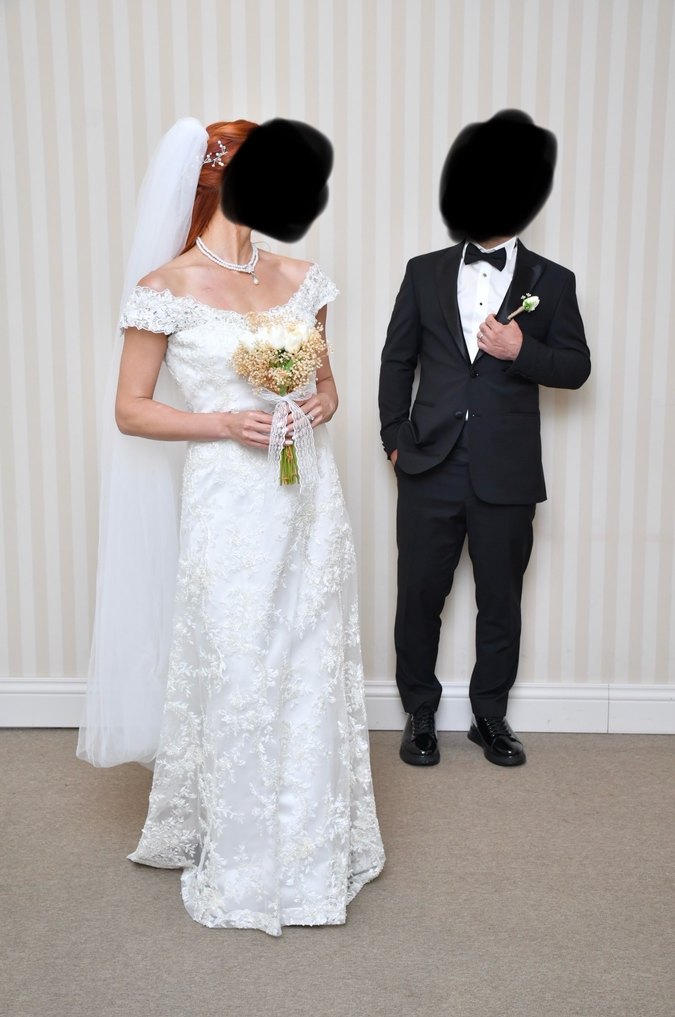 Yalnızca bir kez nikahımda giydim, özel dikim 36 beden gelinlik; (38 beden de rahat kullanabilir) dantel detayları, vücuda oturan formu ve çok yönlü kullanımıyla dikkat çekiyor.Arka etek kısmında hafif kuyruk detayı vardır ve uzun taraklı duvağı ile birlikte verilecektir.Belden oturan kesimi sayesinde hem zarif bir balık görünüm hem de alttan hafif açılan A kesim siluet oluşturur. Omuzları ister normal ( V yaka gibi) , ister düşük omuz şeklinde kullanarak iki farklı stil yaratılabilir – hem romantik hem modern! ✨ Tamamen el işçiliğiyle işlenmiş dantel ve tül detaylarıyla göz alıcı bir zarafet sunar. ✨ V yaka modeliyle boynu zarif gösterirken, arkadaki inci düğmeler nostaljik ve romantik bir hava katar.Sırt detayı mevcut. ✨ Hafif yapısı sayesinde gün boyunca rahatça hareket etmenizi sağlar. ✨ İç kısmı kaliteli saten astar ile desteklenmiştir.