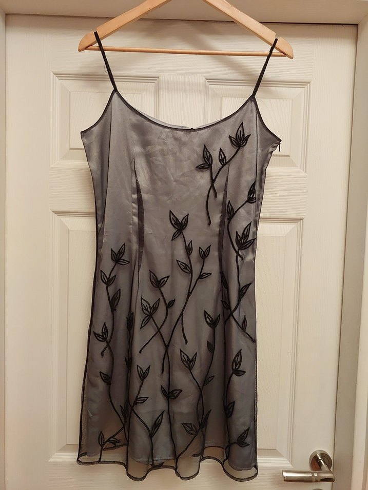 Şık, gri saten üzerine yaprak desenli nakışlı tül detaylı, hafif yapısı sayesinde yaz akşamları, davetler ve özel günler için çok ideal. Yandan gizli fermuarlı. Etiketli hiç kullanılmadı.