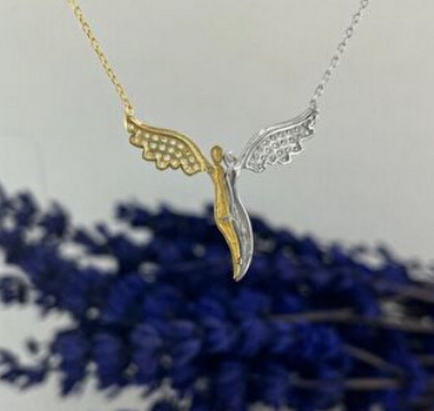 Zincir detaylı, nakışlı kanat figürlü altın kolye. Kısa uzunlukta, çağdaş ve klasik şıklığı romantik akşamlar için buluşturur. ✨925 ayar gümüş