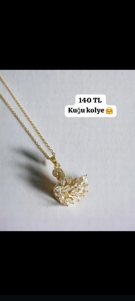 Kısa uzunlukta, altın renkli zincir üzerinde detaylı ve ışıl ışıl kuğu figürü bulunan zarif kolye.