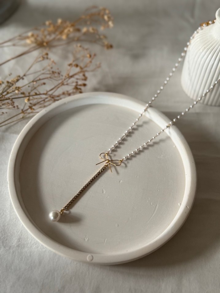 Parlak altın renkli, detaylı zincirli ve inci uçlu zarif fiyonk kolye, günlük kullanıma uygun klasik şıklık sunar. ✨ Çelik takıdır kararma yapmaz.