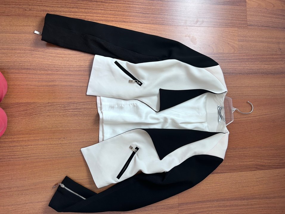 Fitted kesim, çıtçıtlı cepler ve notlu yaka detaylı kadın ceketi. Siyah beyaz renk bloklu, sentetik kumaştan, ofis için uygun.