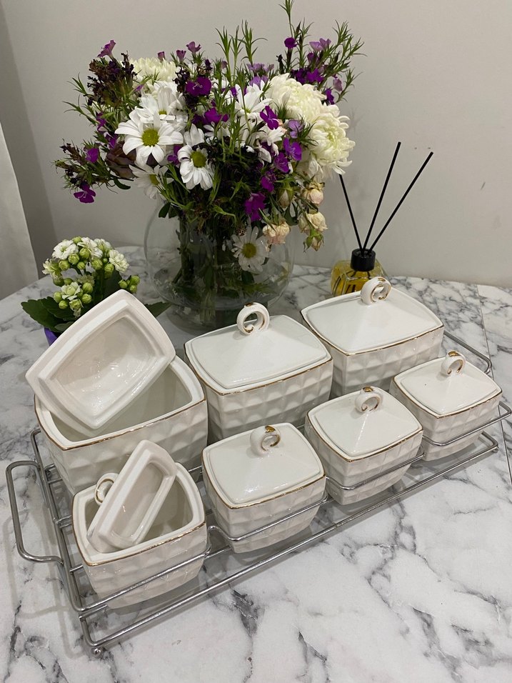 Hiç Kullanılmamış Porselen Baharatlık Seti ✨ Şık ve zarif tasarıma sahip porselen baharatlık seti ✨ Tamamı hiç kullanılmamış, tertemiz ve sorunsuz ✨ Altın detaylı kapaklarıyla mutfakta çok şık durur ✨ Metal standı ile birlikte gönderilecektir ✨ Hem günlük kullanım hem de çeyiz için ideal Kırık, çatlak, kusur kesinlikle yoktur. Fotoğraflar birebir kendi ürünümün fotoğraflarıdır. Özenle paketlenerek gönderilecektir. ❗ İade kabul etmiyorum.
