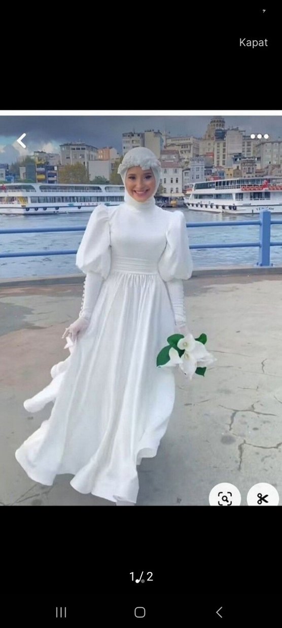 Yüksek yakalı, uzun kabarık kollu beyaz gelinlik, klasik ve sade bir şıklık sunar. Uzun etekli, rahat kesimdir.
