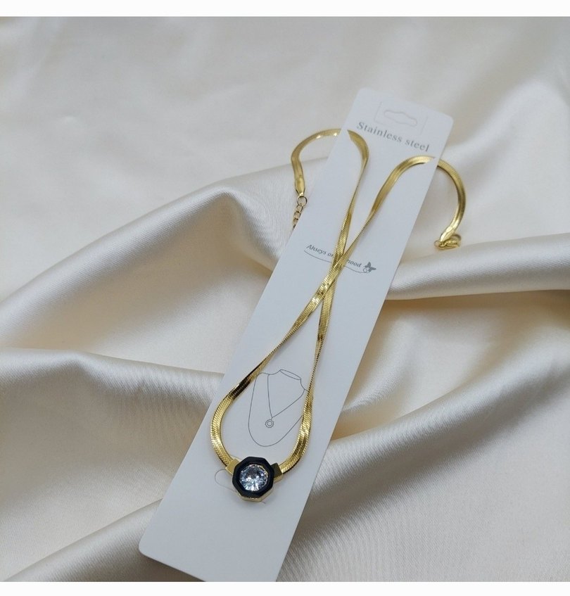 Uzun, yılan desenli detaylı altın zincir kolye, koyu taş süslemeli, çağdaş ve minimal tasarımla klasik şıklık sunar. ✨
