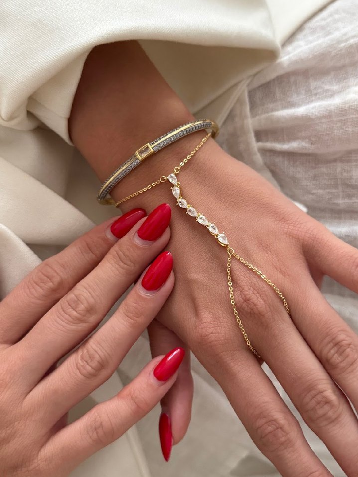 Gold renkli, zarif zincir detayları ve şeffaf taşlarla süslenmiş el zinciri, bohem ve klasik şıklığı düğünlere taşıyor. ️