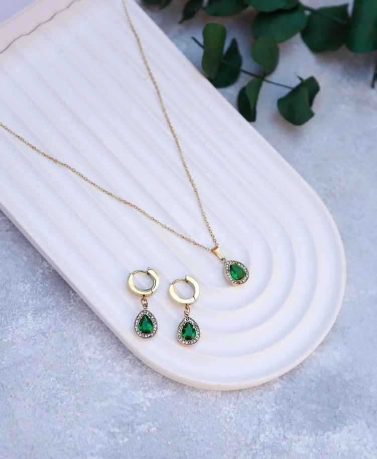 Modern klasik tarzda, hafif yılan deseni bulunan yeşil damla taşlı zarif zincir detaylı takı seti. Günlük şıklık için ideal.