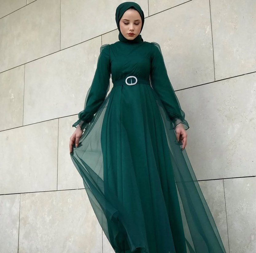 Fitted kesim, yüksek yakalı ve uzun kollu, drapeli uzun abiye elbise. Zümrüt rengi, 2 kere giyildi. çok şık bi model