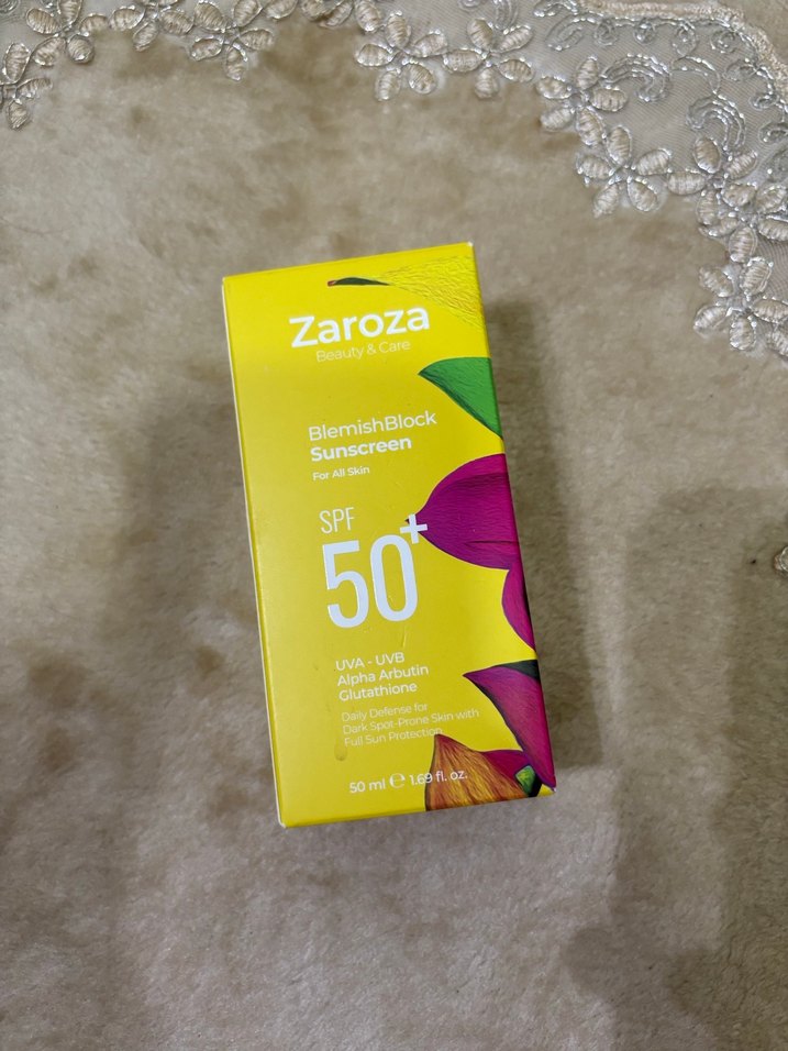 Zaroza BlemishBlock Güneş Kremi SPF 50+ UVA ve UVB koruması sağlar. Alpha Arbutin ve Glutatyon içerir, cilt lekelerini azaltmaya yardımcı olur. 50 ml şişede, tüm cilt tiplerine uygundur. ☀️