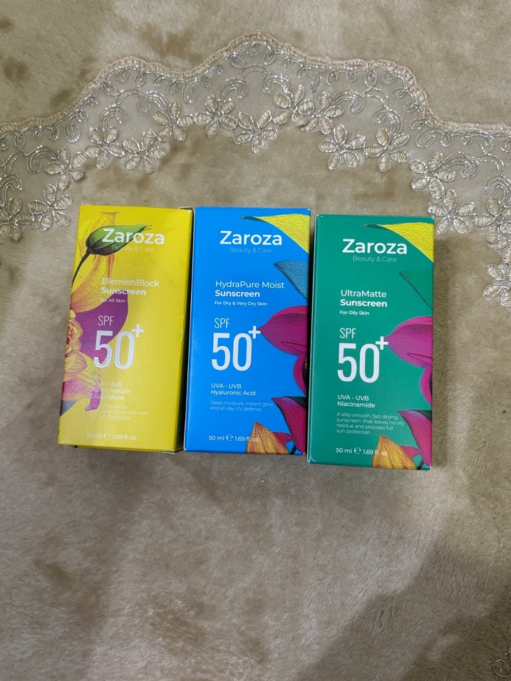 Zaroza'nın SPF 50+ BlemishBlock, HydraPure Moist ve UltraMatte güneş koruyucuları farklı cilt tipleri için özel formüller içerir.