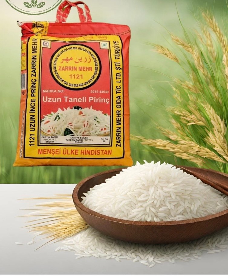 Zarrin Mehr markasına ait, Hindistan menşeli uzun taneli beyaz pirinç 1121 numaralı, hafif renkte ve ince tanelidir.