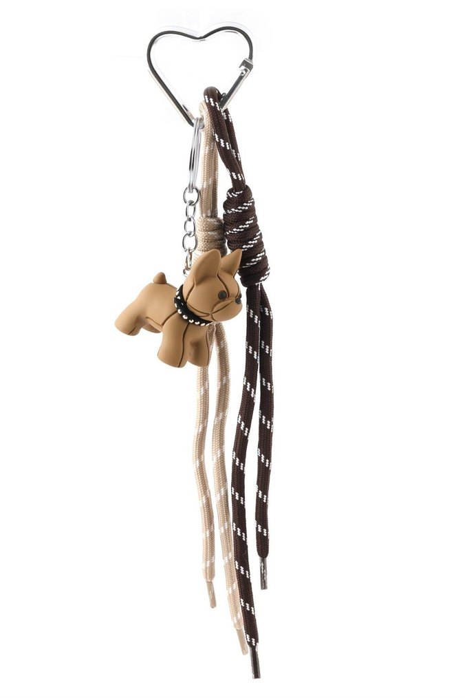 Küçük köpek figürü ve püsküller içeren kahverengi anahtarlık, sokak modası ve Paris avant-garde tarzını birleştirir. Trend belirleyiciler için ideal.