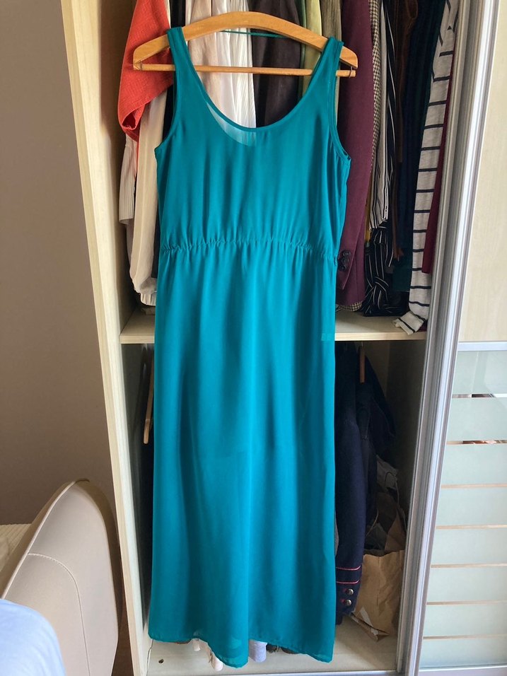 Turkuaz renkli, askılı ve uzun elbise. İpeksi dokusu ve drapeli tasarımıyla bohem tarzı yansıtır, günlük kullanım için uygundur. Hiç giyilmedi, rengi fotoğraftakinden biraz daha canlı bir yeşildir