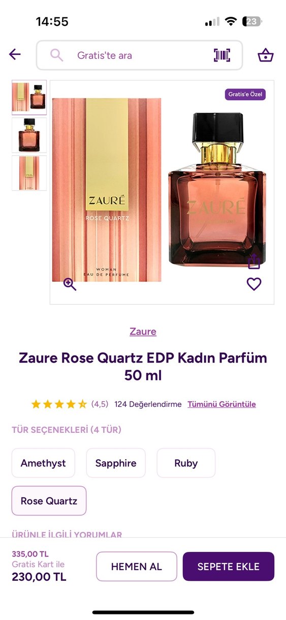 Zaure Rose Quartz Kadın Parfümü, 50 ml şık şişede sunulur. Amethyst, Sapphire ve Ruby seçenekleriyle Zaure koleksiyonundandır.
