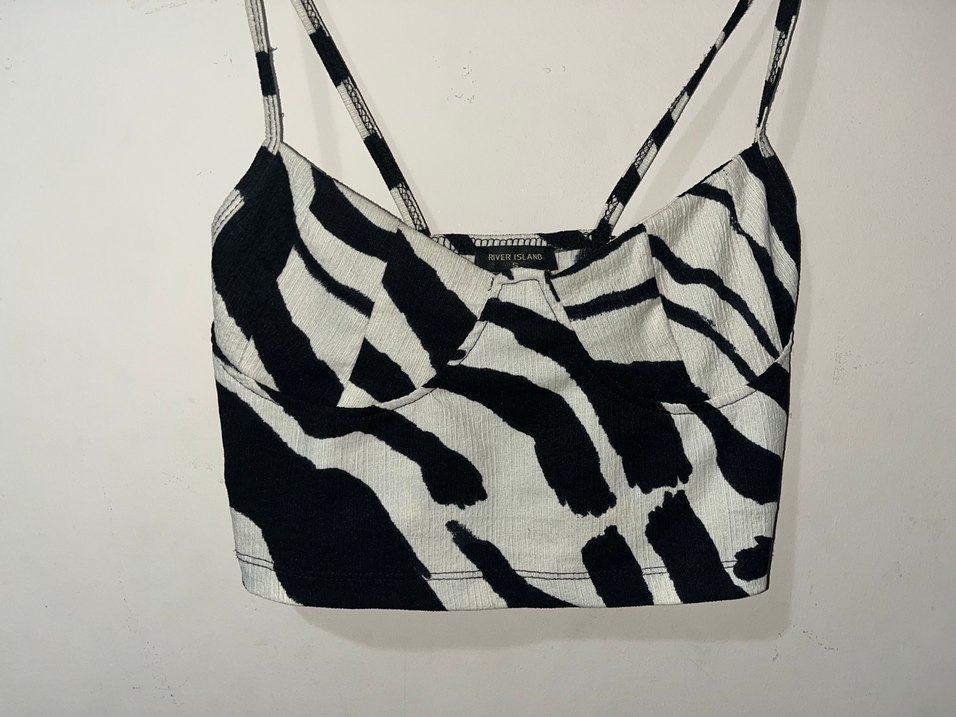 Zebra desenli, pileli dokulu, askılı ve tekne yaka, günlük sokak stiline uygun fitted kadın büstiyer.