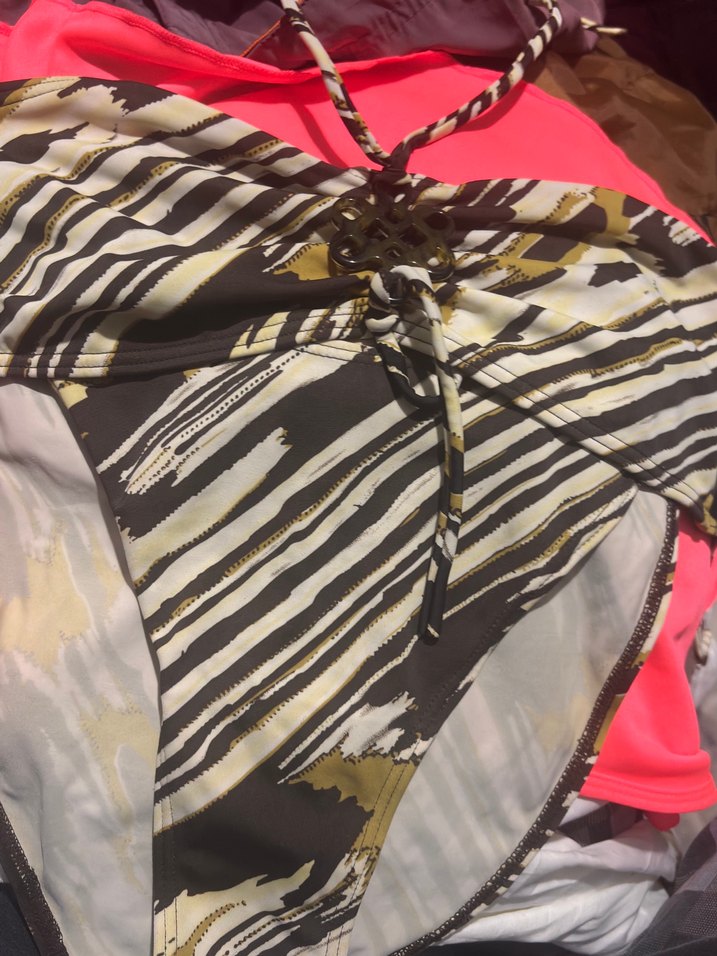 Renkli, zebra desenli kadın bikini, askılı ve drapeli ön detaylıdır. Kısa ve vücuda oturan modern kesimiyle günlük kullanıma uygundur.