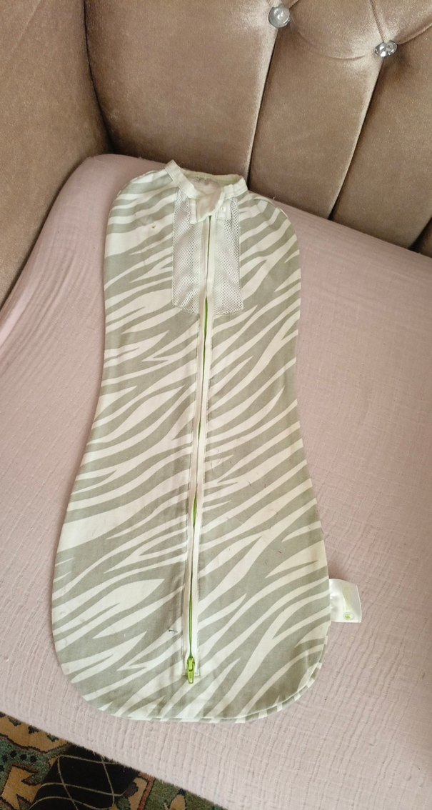 Bej ve gri zebra desenli, yumuşak sentetik kumaştan yapılmış bebek uyku tulumu. Ön fermuar ve nefes alabilir file yakaya sahiptir.