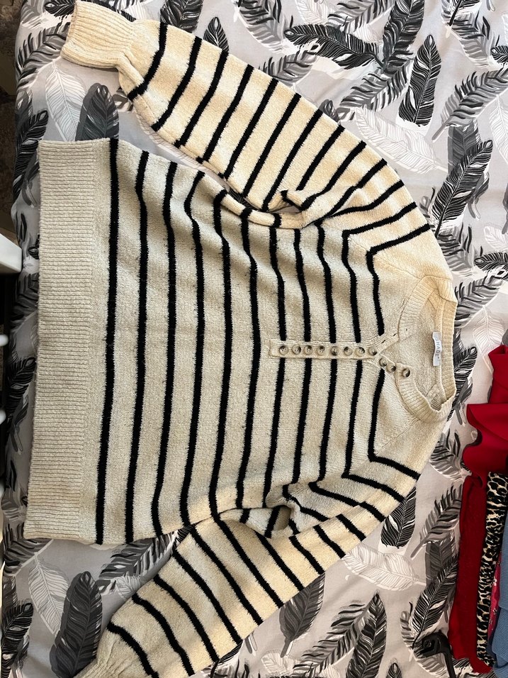 Beyaz ve gri zebra desenli, uzun kollu, yuvarlak yaka, bol kesim kadın triko kazak. Günlük kullanım için uygun, rahat bir sokak stili sunar. Hafif tüylenmeler mevcut