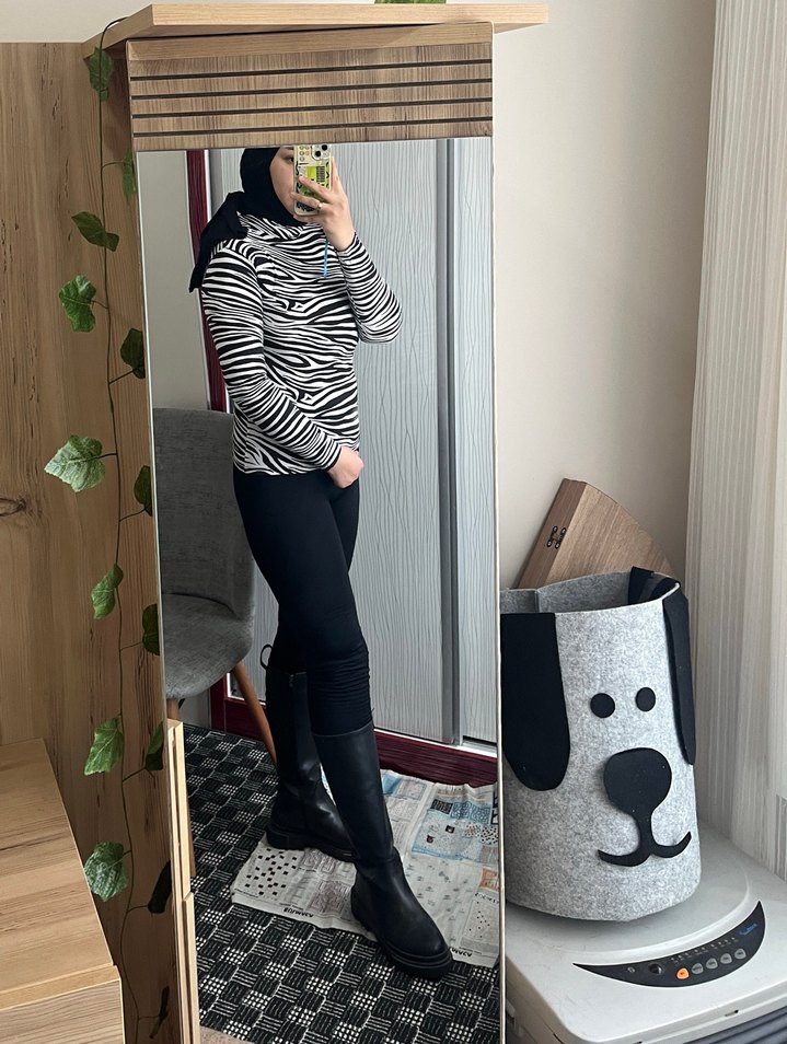 Tesettür mayo üstü olarak kullanılabilir Zebra desenli, balıkçı yaka ve uzun kollu kadın bluz, Yumuşak sentetik kumaştan, siyah beyaz tonlarda, sokak ve spor tarzına uygun.
