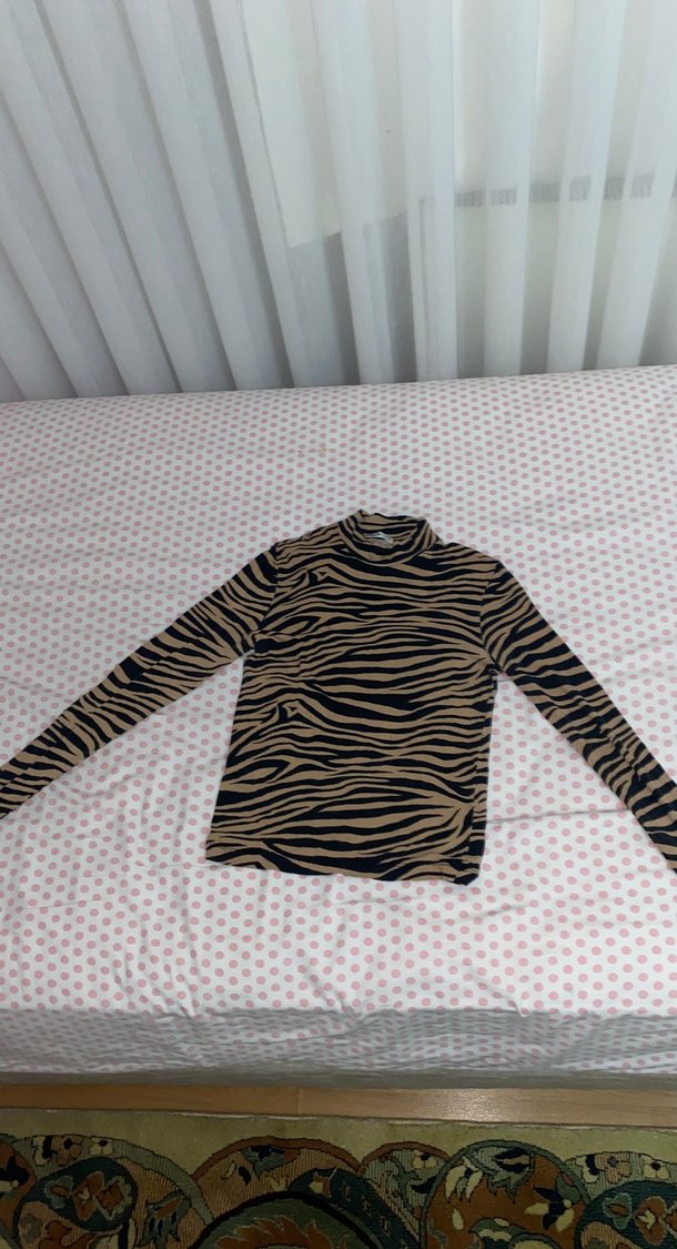 Kahverengi zebra desenli, boğazlı ve uzun kollu, sentetik kumaştan örme kadın bluz. M beden