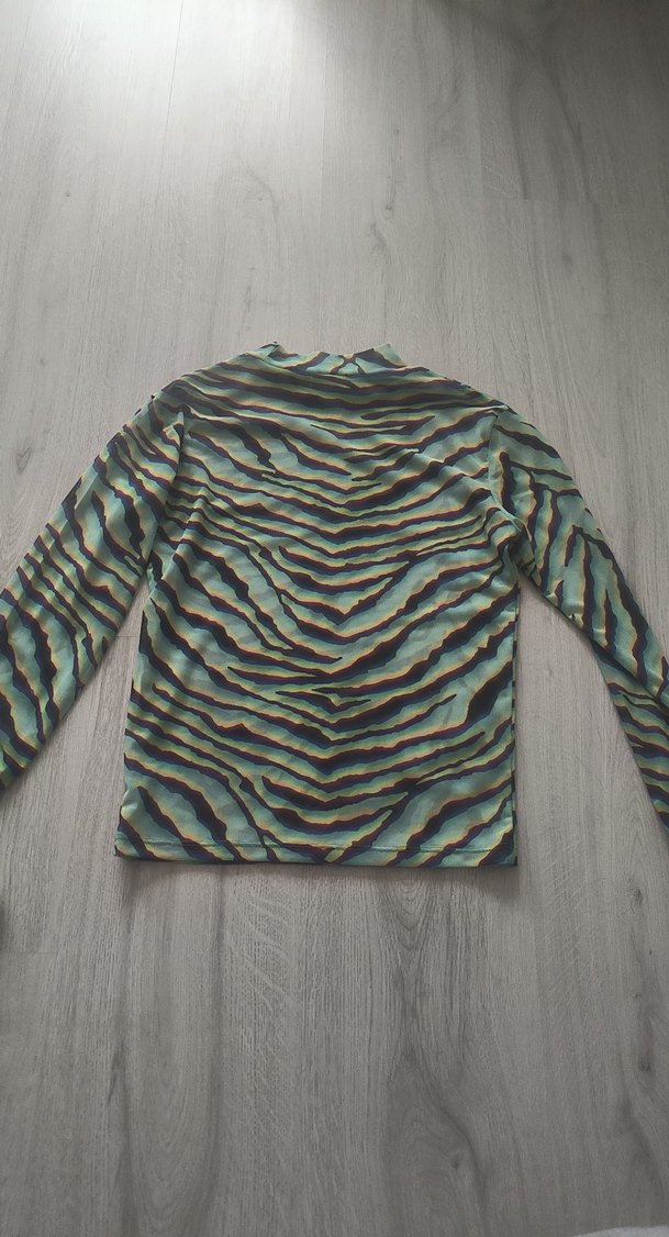 Kadınlar için boğazlı, uzun kollu, zebra desenli ve pileli detaylara sahip dar kesim bluz. Sentetik kumaştan üretilmiş, midi boyda, dış mekan kullanımı için uygun.