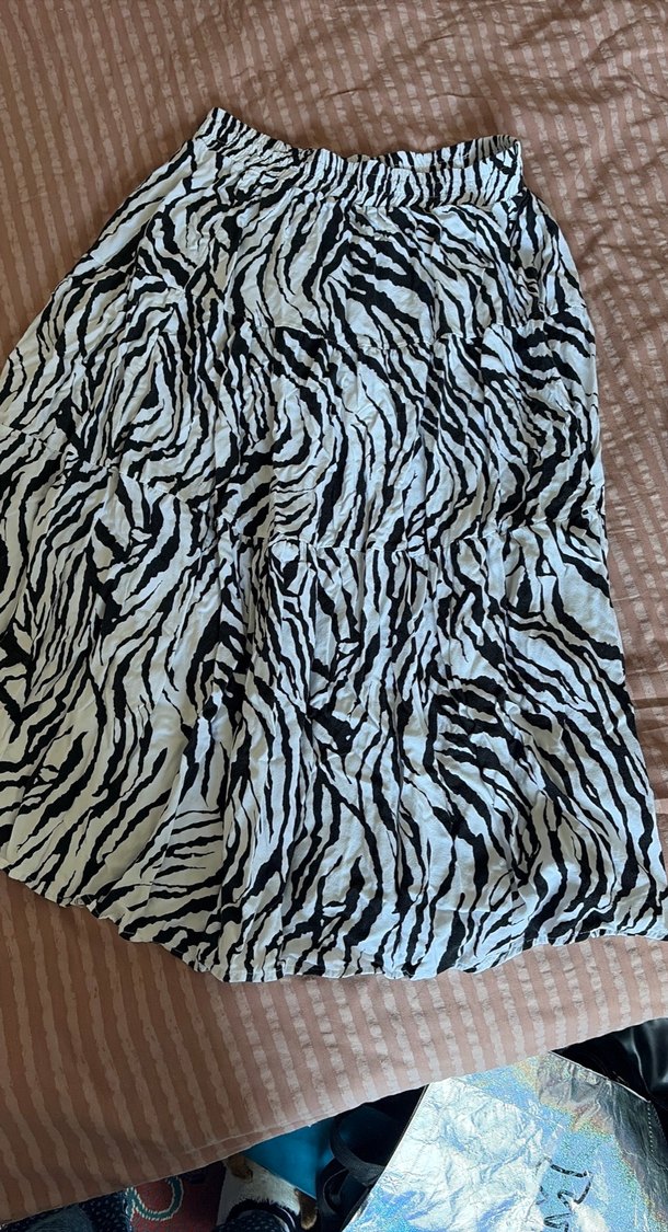 Zebra desenli, fırfırlı kadın midi etek, yumuşak keten kumaştan üretilmiş. Bol kesim ve uzun boy, bohem tarzı için uygun.