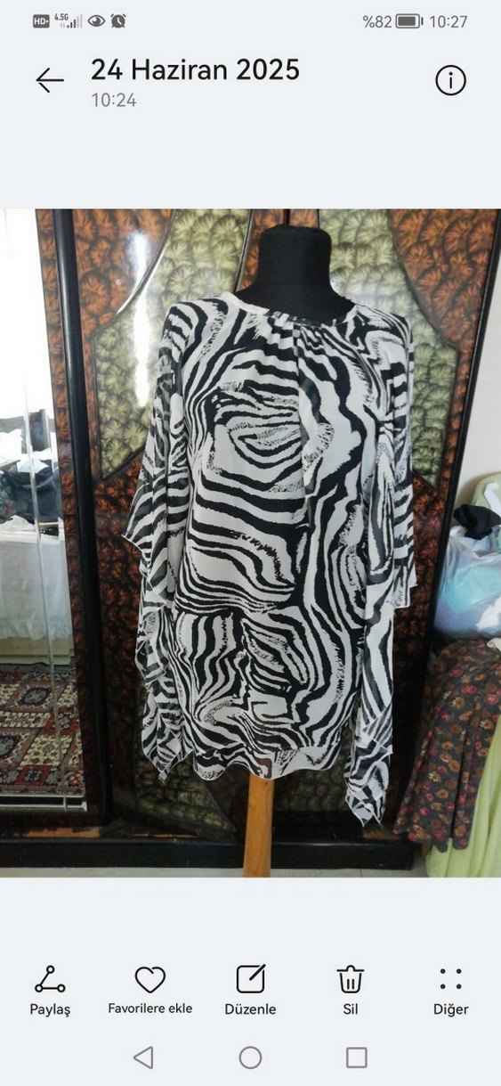 Gri zebra desenli, yumuşak sentetik kumaştan, bol kesim ve uzun boy bohem kadın tunik. dökümlü tasarıma sahip.