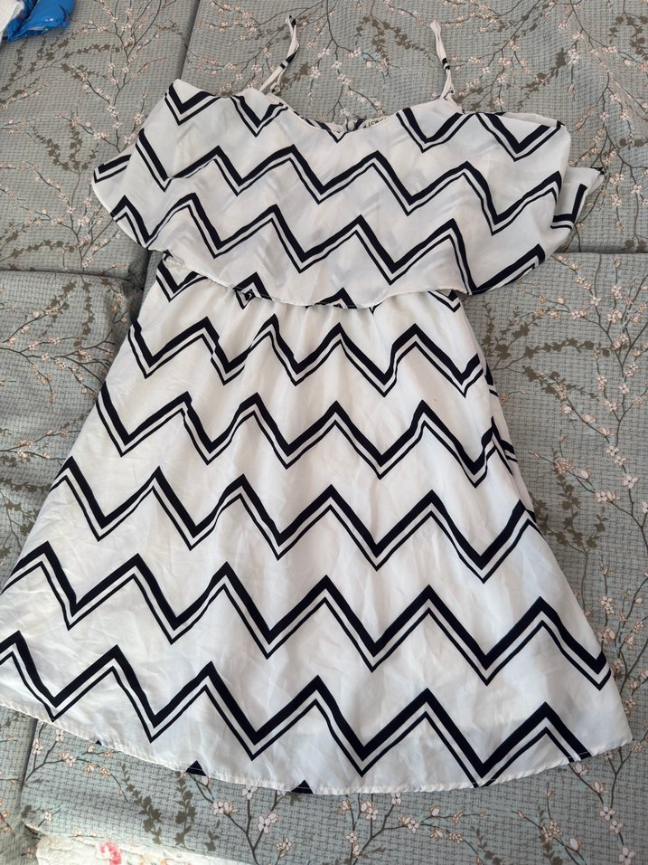 Beyaz ve gri zebra desenli, askılı ve fırfır detaylı bol kesim Yumuşak sentetik kumaştan, parti için uygun.