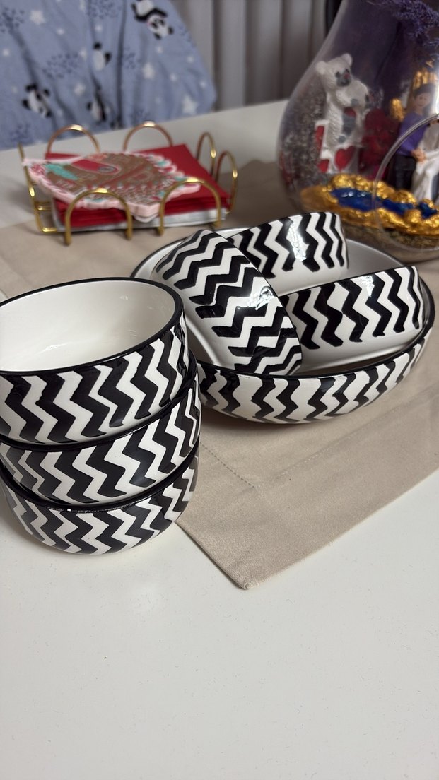 Siyah beyaz zebra desenli, bohem tarzda tabak ve kaselerden oluşan set. Masanıza renkli ve canlı bir dokunuş katar.