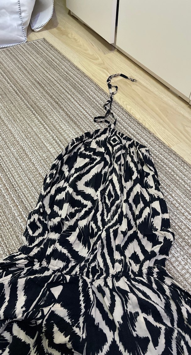Gri zebra desenli bohem uzun elbise, yüksek yakalı ve askılı kolludur. Zincir detayları ve bol kesimiyle sentetik kumaştan yapılmıştır.
