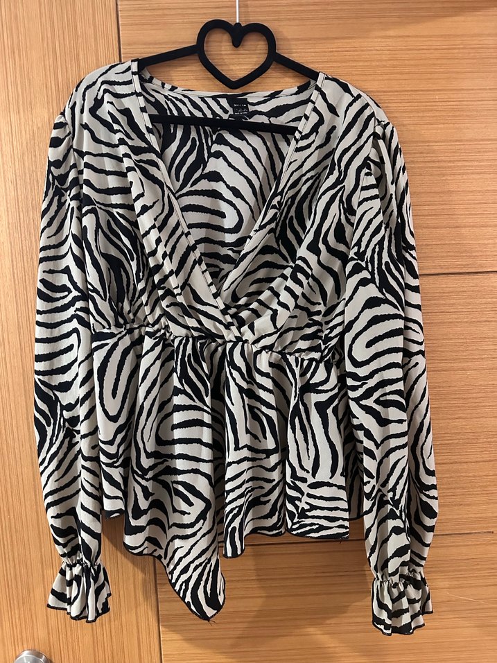 Zebra desenli, uzun kollu ve V yakalı bol kesim bluz