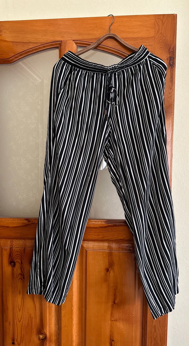 Uzun, bol kesim kadın kumaş pantolon, zebra desenli ve pileli tasarıma sahiptir. Siyah-beyaz renkte, sentetik kumaştan yapılmıştır, bohem ve günlük kullanıma uygundur.