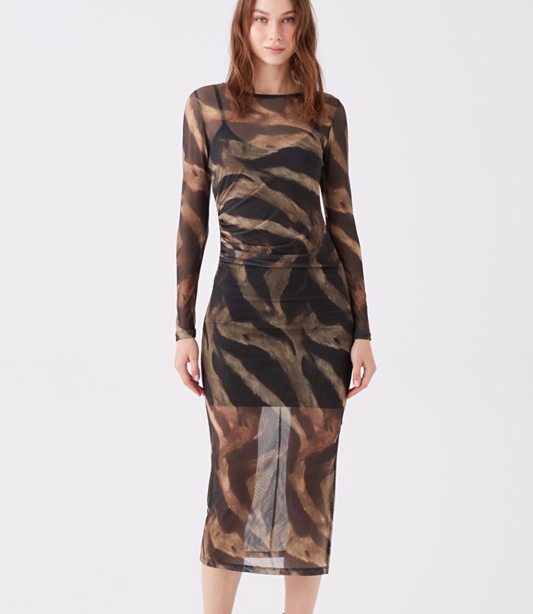 Zebra desenli dik yaka vücudu saran uzun elbise