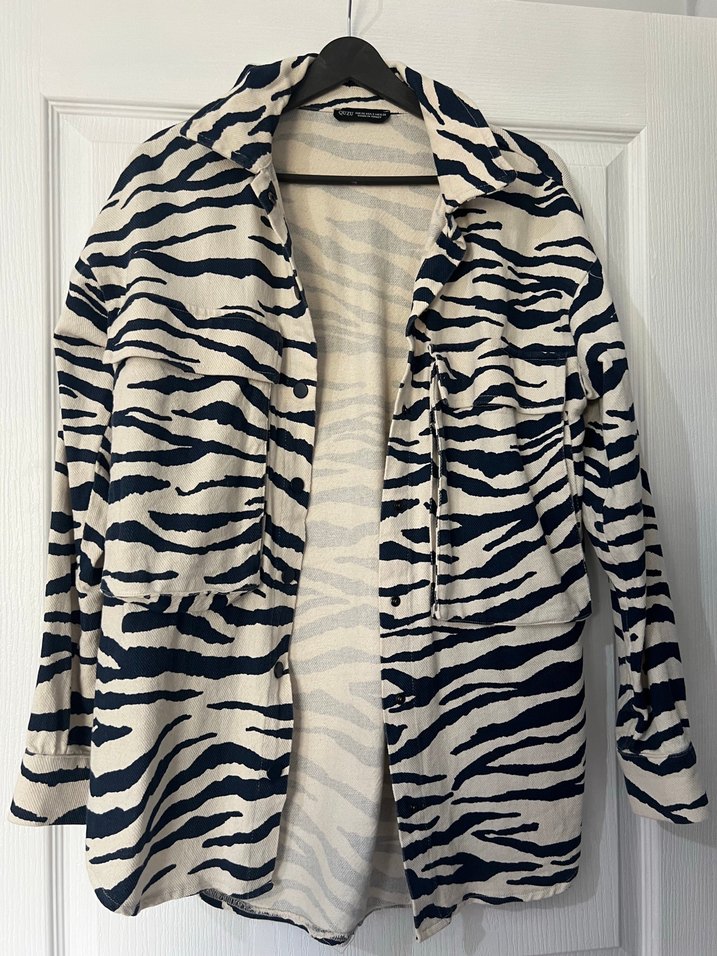 Bej ve gri zebra desenli, uzun kollu, düğmeli, notched lapel yakalı, midi uzunlukta, bol kesim kadın gömleği. Günlük kullanıma uygundur.