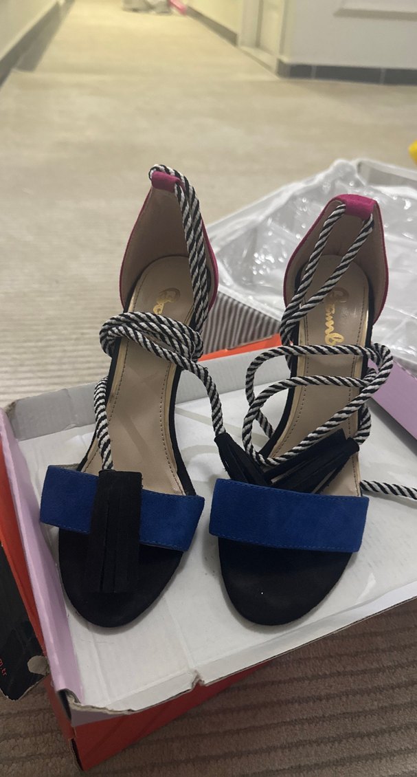 Bu kadın topuklu ayakkabılar, stiletto topuk ve elastik bantlara sahiptir. Koyu çok renkli zebra deseni, çağdaş bir tarz sunar.
