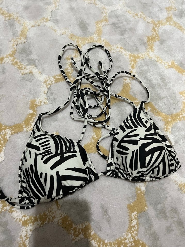 Zebra desenli, fırfırlı ve askılı tasarıma sahip mini bikini üstü. Bohem ve avangart tarzda, dış mekan kullanımı için uygundur.