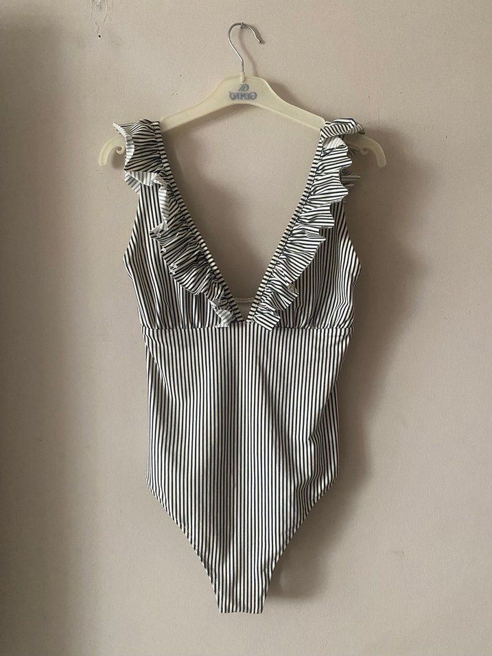 Zebra desenli, derin V yakalı ve fırfırlı detaylı, strappy kollu kadın mayo. Günlük kullanıma uygun, şık ve trend sokak stili. Etiketi batmadan dılayı kesiktir