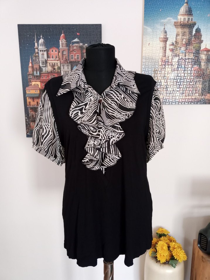 Yaka ve kolları fırfırlı zebra desenli şifon Siyah beden kısmı pamuklu İki koltuk altı arasi 49 cm Boyu 66 cm