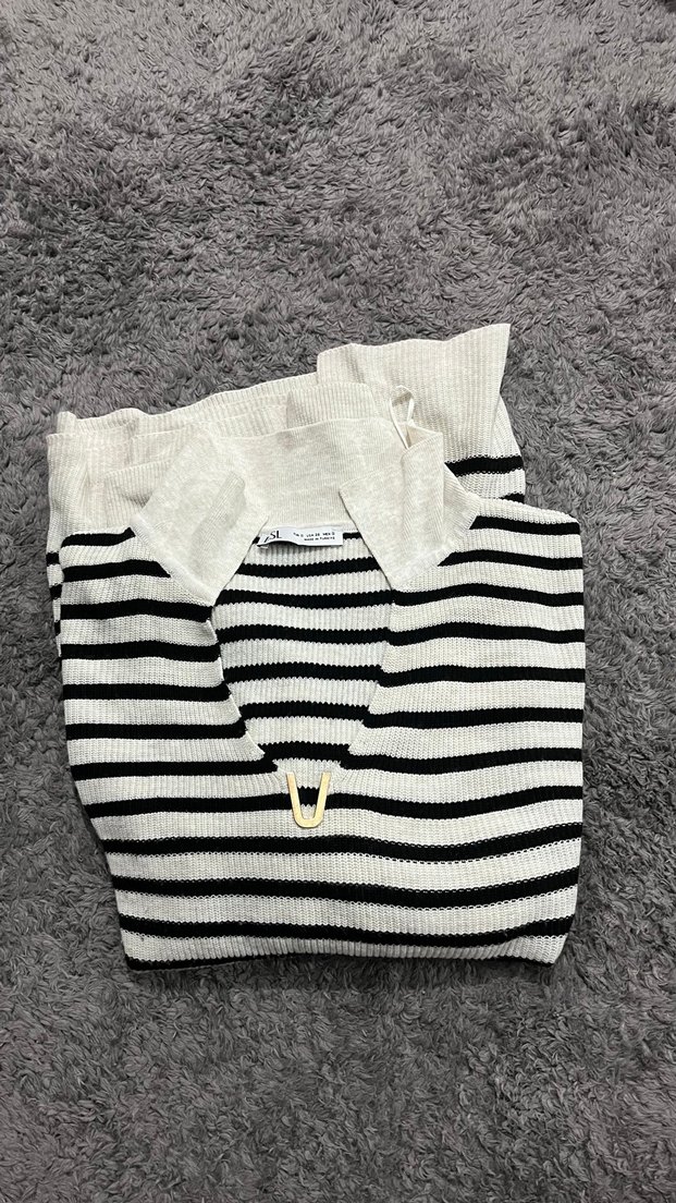 Gri zebra desenli, yakalı ve uzun kollu, kısa kesim, fitted kadın kazak. Rahat örme kumaştan, sokak stiline uygun.