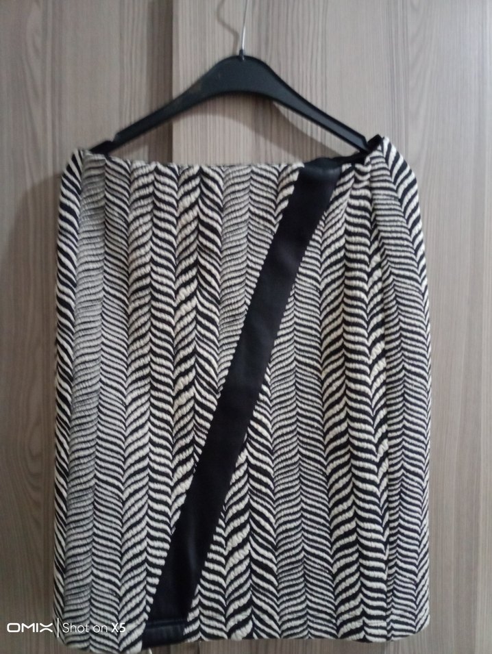 Gri renkte, zebra desenli, fermuarlı ve sentetik kumaştan mini etek. Normal kesim ve çağdaş tarzda, günlük kullanıma uygun. Üzerinde OMIX etiketi var. sıfır ürün..