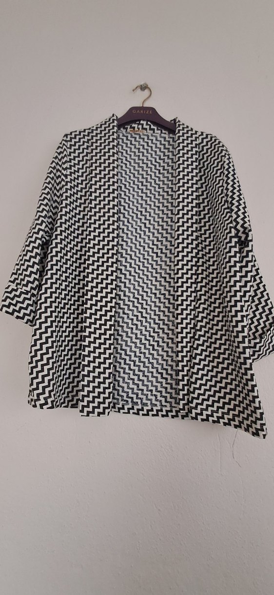Uzun kollu, kayık yaka ve bol kesim kadın kimono. Zebra desenli, pilili ve midi boyda, sokak stili için uygun. Sentetik kumaştan, günlük kullanıma ideal. 44_46 beden uyumludur