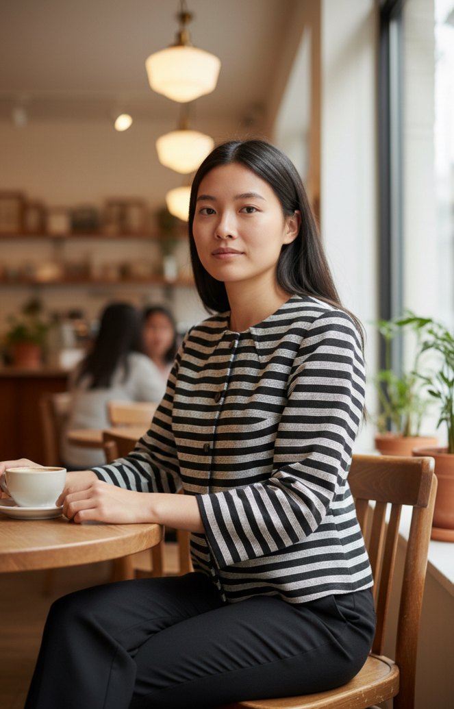 Düz yakalı, regular fit, uzun kollu ve midi boyda, gri ve bej tonlarında zebra desenli kadın ofis ceketi. Günlük kullanıma uygun, zahmetsiz şıklık sunar.