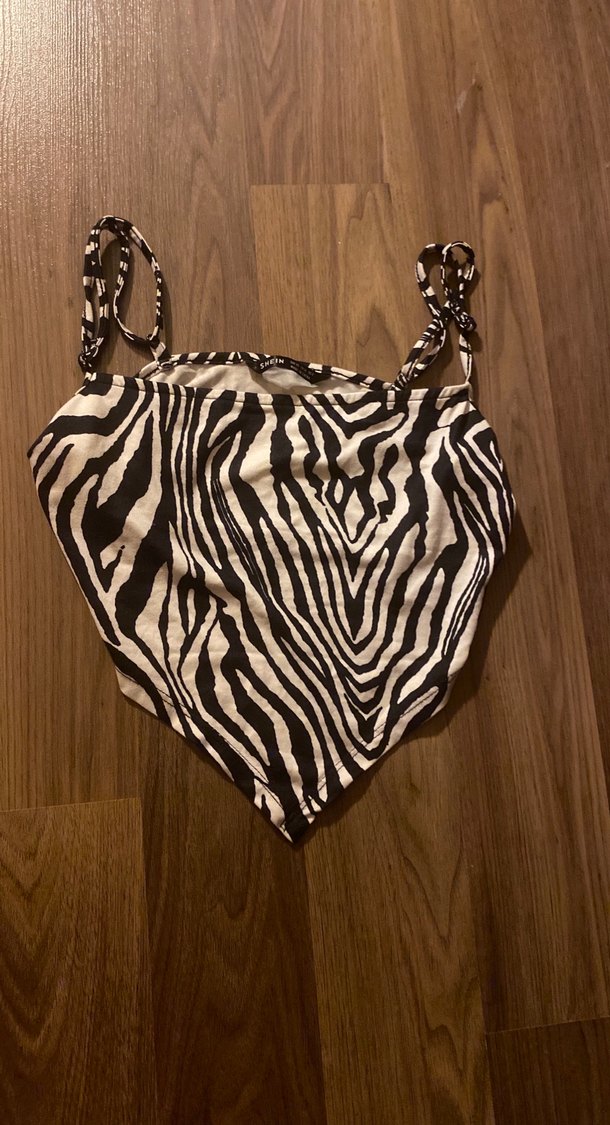 zebra desenli, ince askılı, bağcıklı detaylı ve vücuda oturan büstiyer. Bohem ve grunge punk tarzı için uygun, dış mekan kullanımı için ideal.