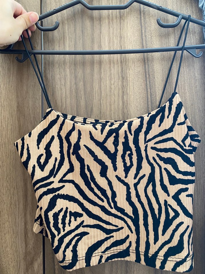 Dar kesim, zebra desenli ince askılı kadın atlet. Yumuşak sentetik kumaştan, pile detaylı, gündelik sokak stiline uygun.