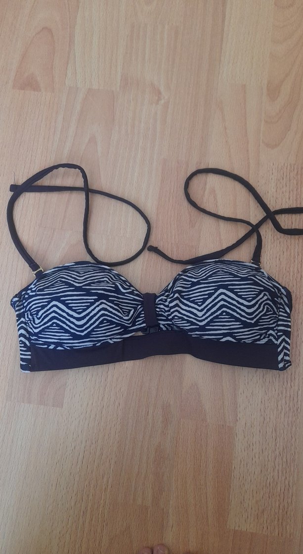 İpli kol detaylı, elastik bantlı, mavi zebra desenli kadın bikini üstü. Bohem tarzıyla plajda kullanıma uygundur. ️