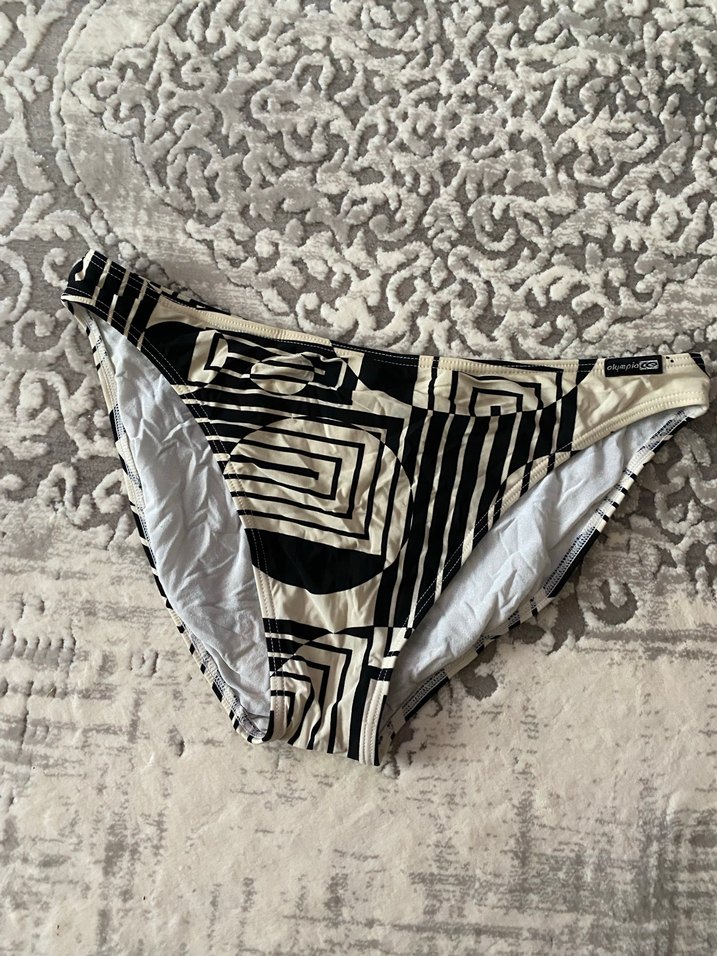 Bej ve gri tonlarda zebra desenli, pileli detaylı, vücuda oturan kadın bikini altı. Plajda kullanıma uygun. ️