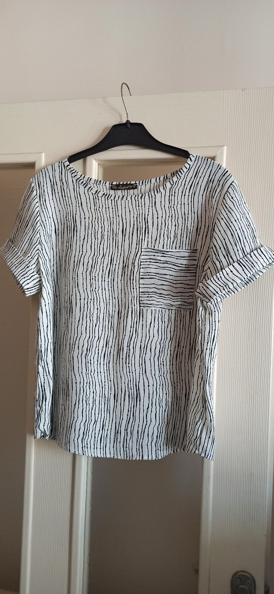 Viskon kumaştan, kısa kollu, salaş kesim ve tekne yaka kadın bluz. Beyaz ve gri zebra desenli,günlük sokak stili için uygundur.