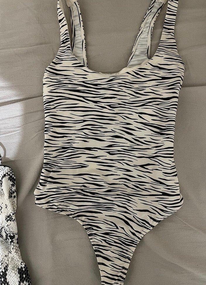 Gri ve beyaz zebra desenli, askılı ve vücuda oturan kadın body. Günlük kullanıma uygun, zahmetsiz şıklık sunar.