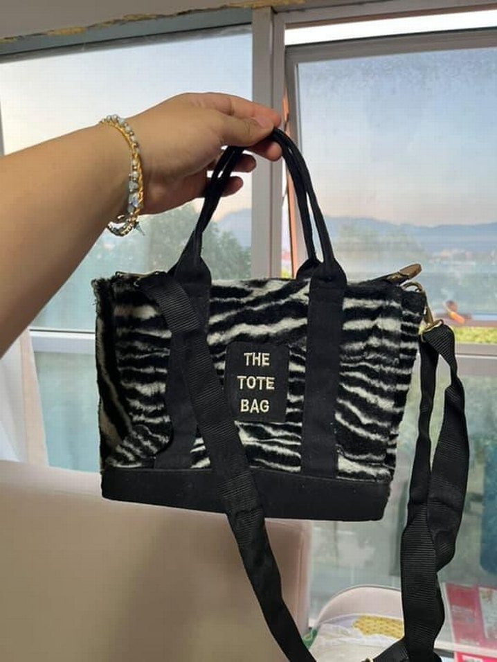 Kürk detaylı zebra desenli kadın çanta, yumuşak tekstil malzemeden yapılmıştır. Siyah tonlarda, elde ve omuzda taşınabilir askıları vardır. 'THE TOTE BAG' yazılıdır.